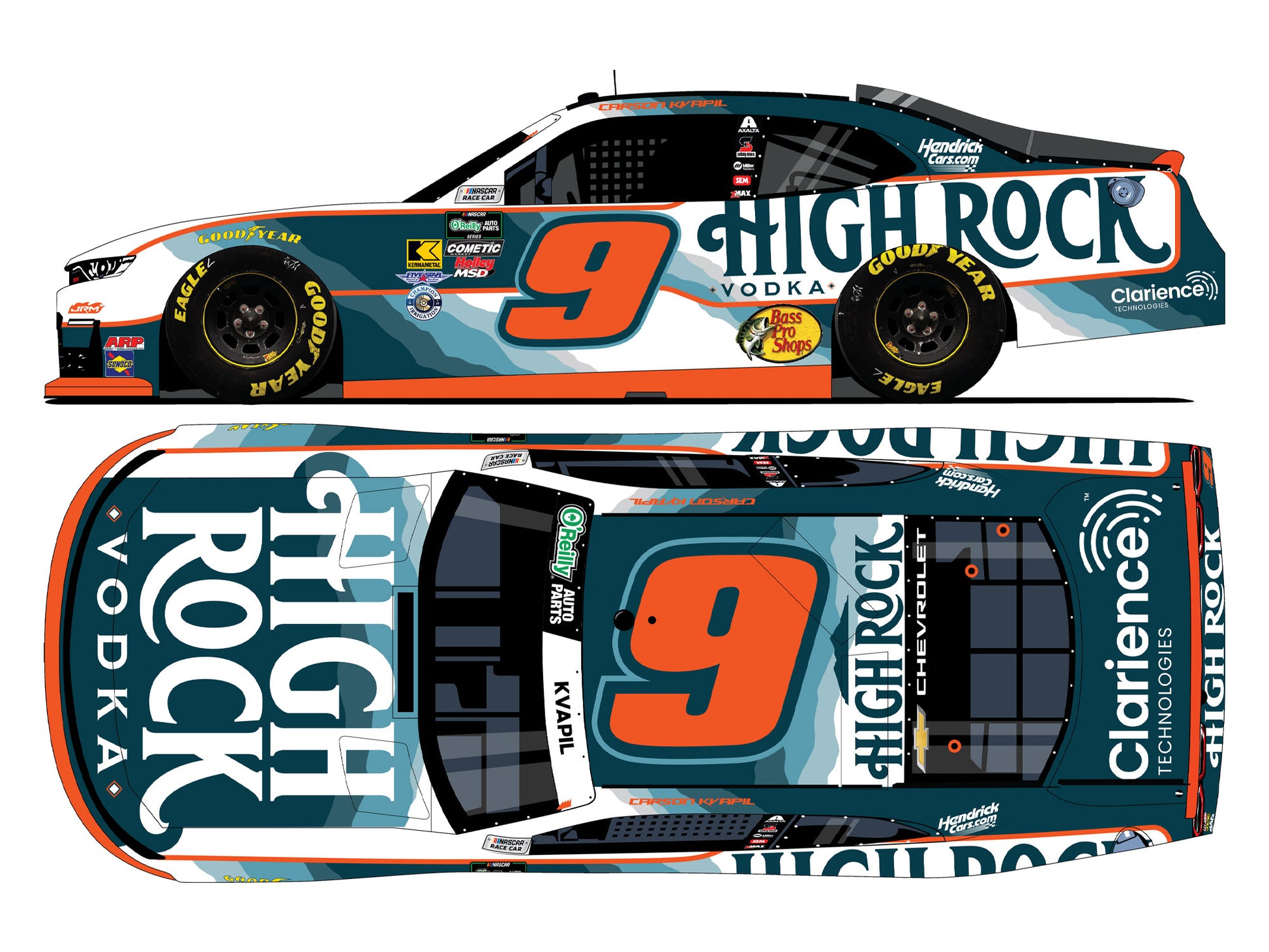 High Rock, a premium vodka from Sugarlands Distilling Company championed by Dale Earnhardt Jr. and Amy Earnhardt, will take center stage on Carson Kvapil’s No. 9 Chevrolet in the April NASCAR O’Reilly Auto Parts Series® race at Bristol. Now fans can add the official Lionel Racing die-cast of Kvapil’s No. 9 High Rock Vodka Chevrolet to their NASCAR® collections.